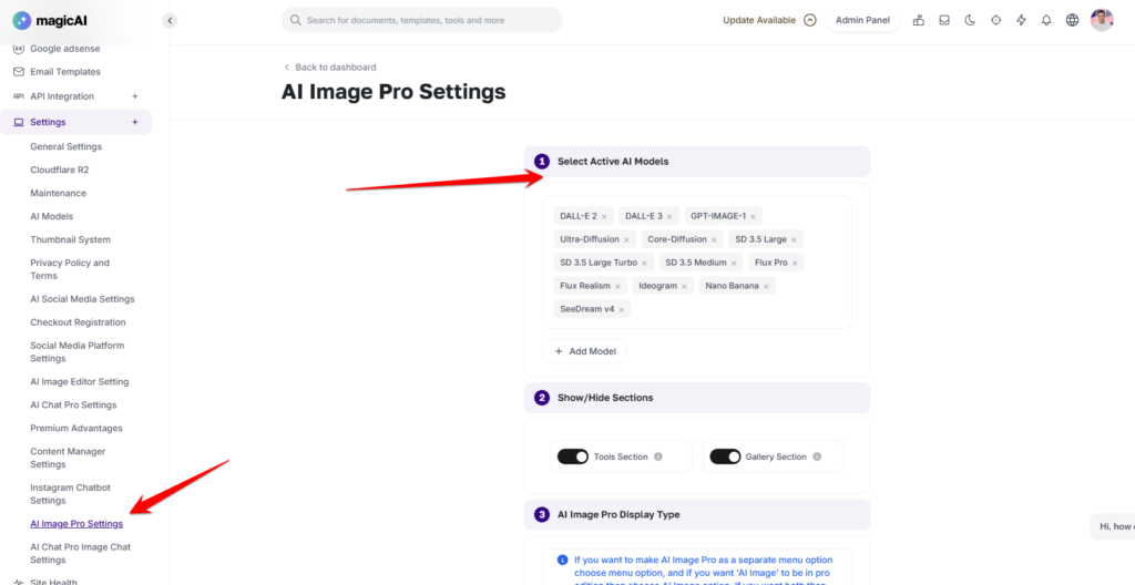 The Model Selection feature allows administrators to curate the specific AI engines available to your users. Through the admin dashboard, you can enable or disable various high-performance models (such as DALL-E 3, Stable Diffusion, or Midjourney) based on your subscription tier or quality preferences.