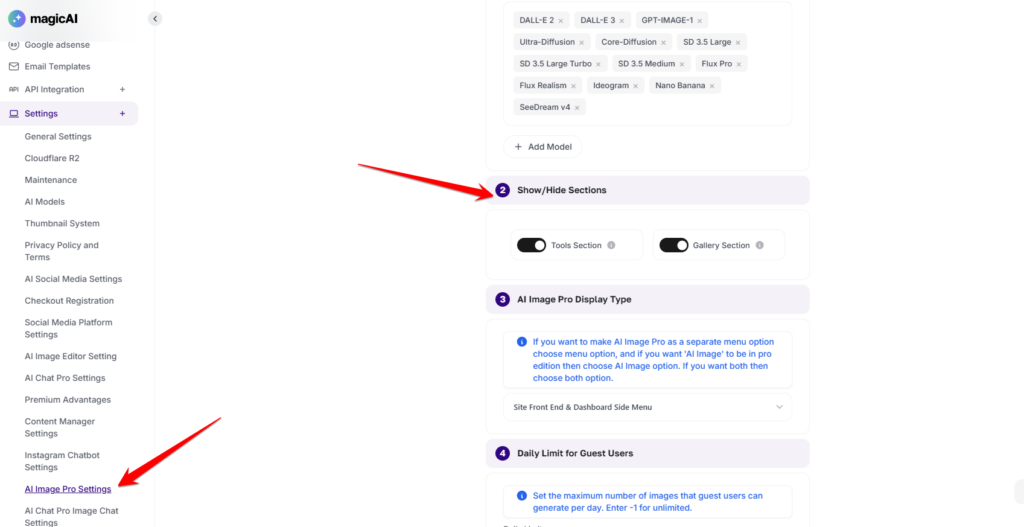 The AI Image Pro extension includes a robust admin panel, giving you complete control over how the tool functions across your platform. From this dashboard, administrators can curate the available AI Models, toggle the visibility of specific feature sections, and choose the display layout that best fits your site’s aesthetic. Additionally, you can manage platform resources by setting daily usage limits for guest users and customizing the footer settings to include brand-specific links or disclosures, ensuring a tailored experience for every user.
