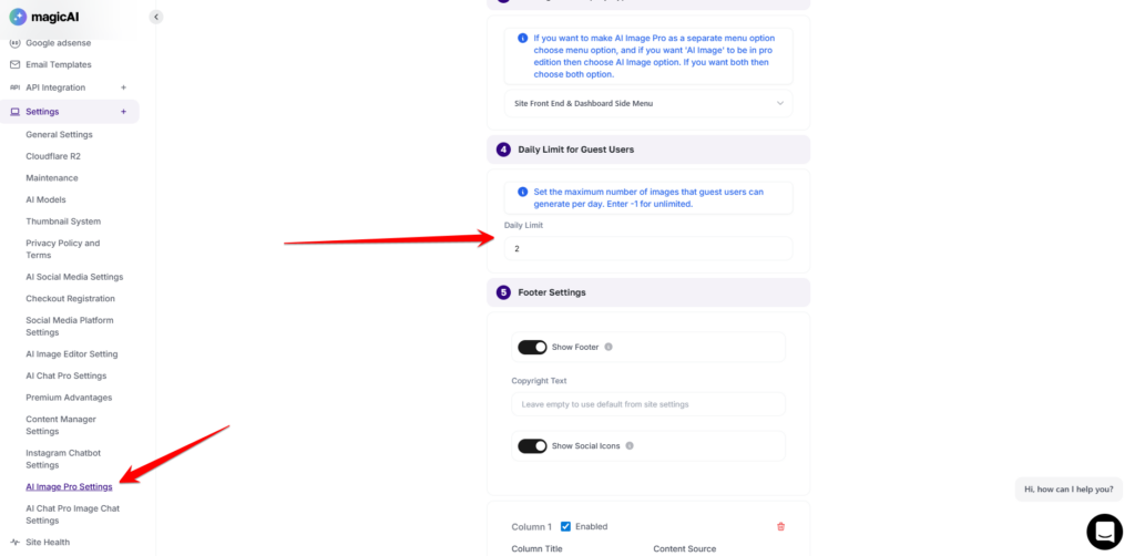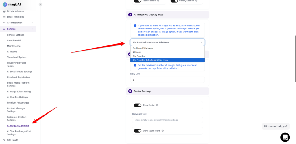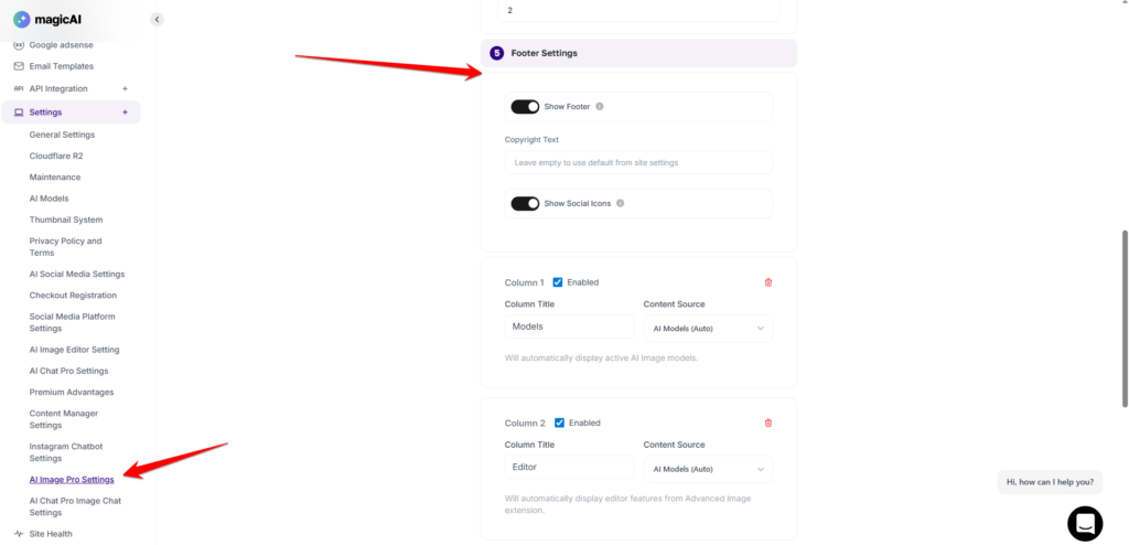 The Footer Settings allow administrators to personalize the bottom area of the AI Image Pro interface. This section is essential for maintaining brand consistency and providing users with helpful external resources.