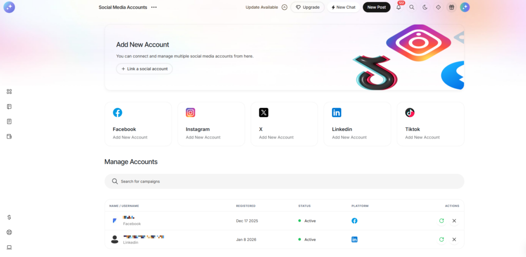 The Accounts section serves as the central management hub for your platform integrations, displaying a comprehensive list of all social media profiles currently connected to your agents while providing a streamlined option to link additional accounts as your brand grows. Within this view, you can monitor the real-time connection status of each profile—such as LinkedIn, X, or Instagram—and use the “Connect More” feature to authorize new platforms, ensuring your AI agents have the necessary access to execute your content strategy across your entire digital footprint.