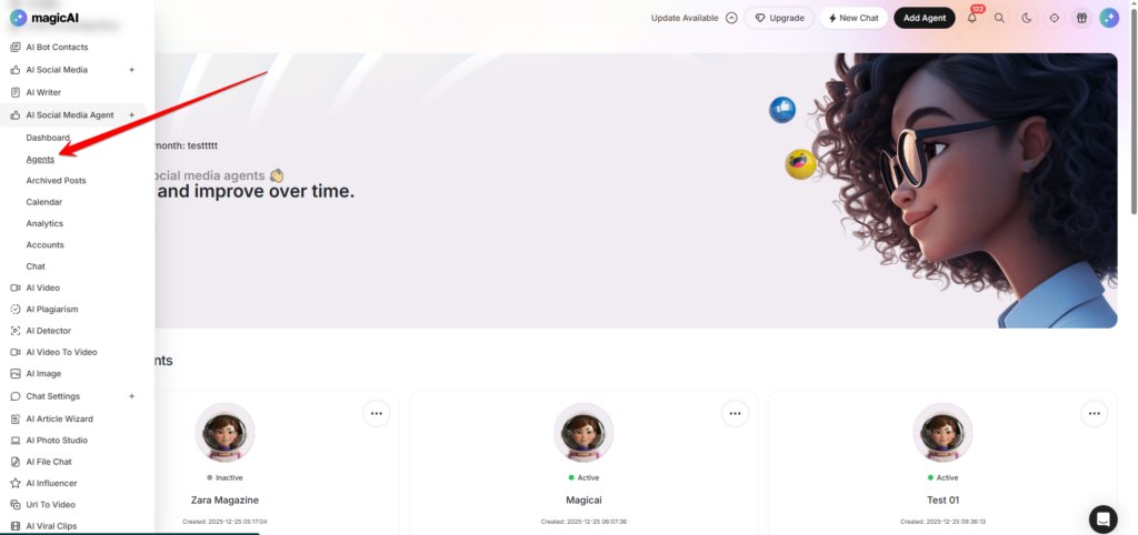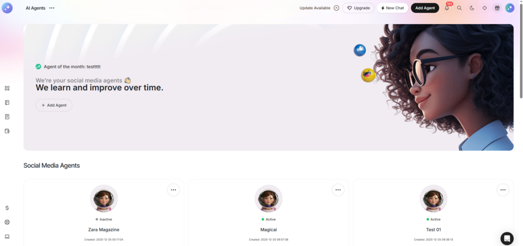 The Agents section is where you define the personality and strategy of your AI. You can manage existing agents—adding new ones as your brand grows or removing those that are no longer needed—to ensure your social presence stays focused.