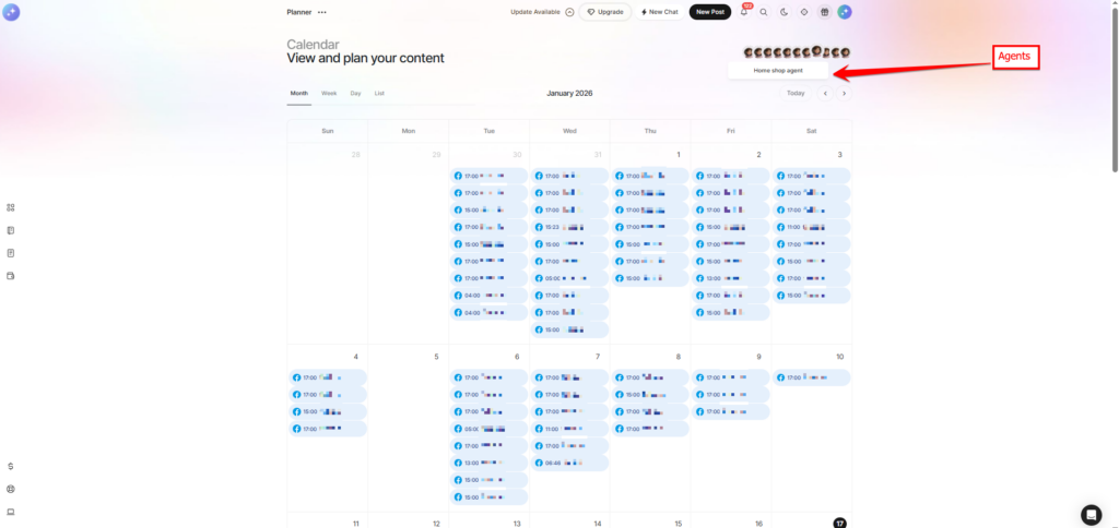 The Calendar is your visual roadmap for social media success. It provides a comprehensive, bird’s-eye view of your entire content strategy, allowing you to track which Agent is posting, on which Platform, and at what Time.