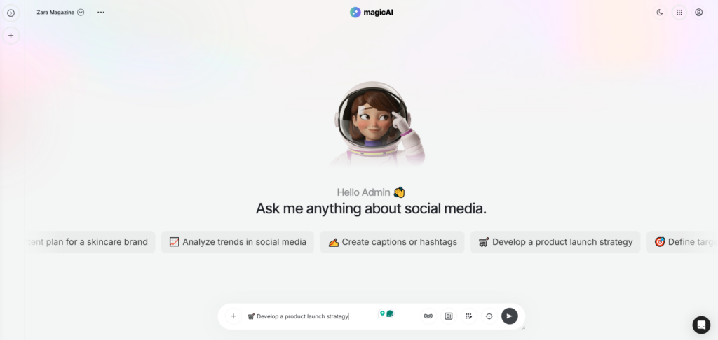 As an administrator, you have the authority to configure Example Prompts that appear within the Social Media Agent interface. These prompts serve as a guide for users, helping them understand how to best communicate with the AI to get high-quality results.