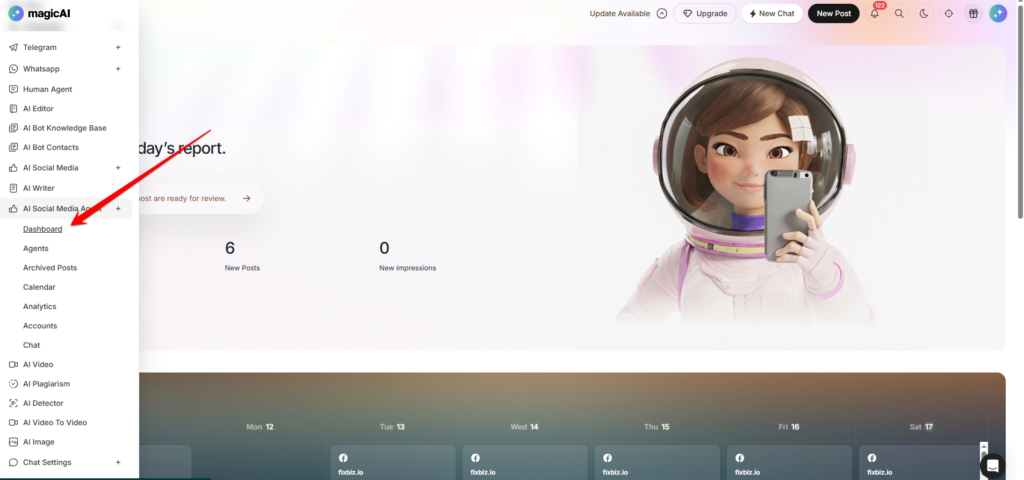 The Dashboard is your central hub for monitoring all activities related to your Social Media Agents. It provides a real-time overview of your content pipeline, agent performance, and engagement across all connected social accounts.