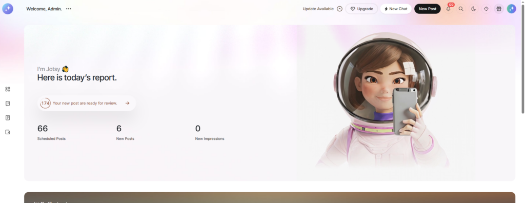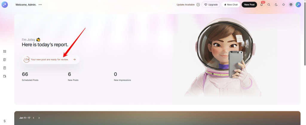 - Action Center: Posts Ready to Review: This section is crucial for workflows requiring human oversight. Here, you’ll find all AI-generated content drafts that are awaiting your approval before being added to the publishing schedule.