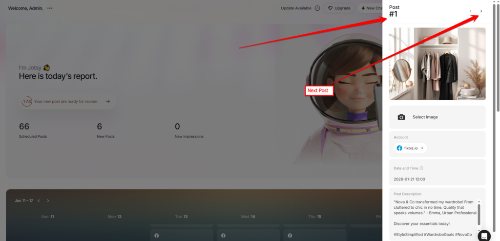 Navigation: Click on any date to see scheduled posts for that day, or click the calendar icon to navigate to the full Calendar feature for detailed planning and management.