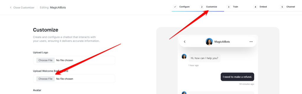 In this step, you can customize your chatbot as you wish. You can see a live preview of your changes on the right side of the page. - Training Chatbot