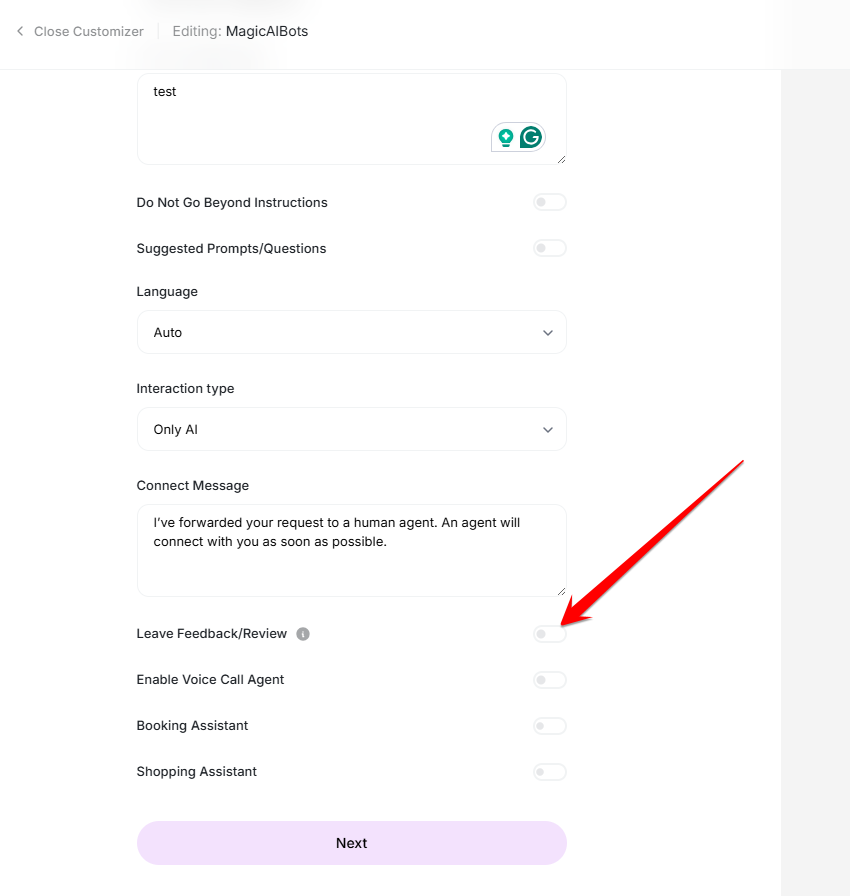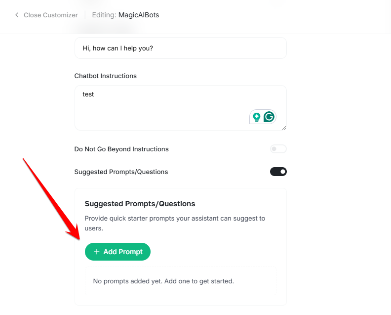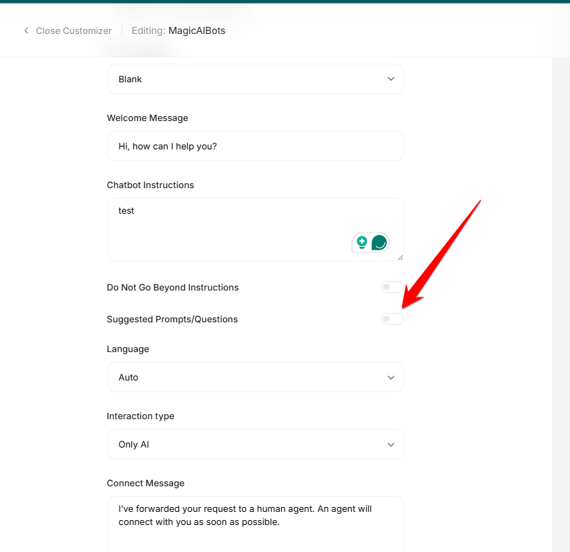 Example: You are an AI support assistant for MagicAI. Act professionally. Add “If there is anything else I can help with, feel free to let me know!” at the end of your answers. - Do Not Go Beyond Instructions: Enable this if you want the AI to strictly follow your instructions.