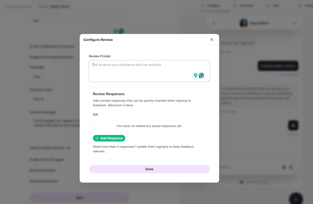 File Attachments: To allow users to send file attachments during live conversations, adjust the conversation settings in the chatbot’s configuration. This provides a more interactive support experience.